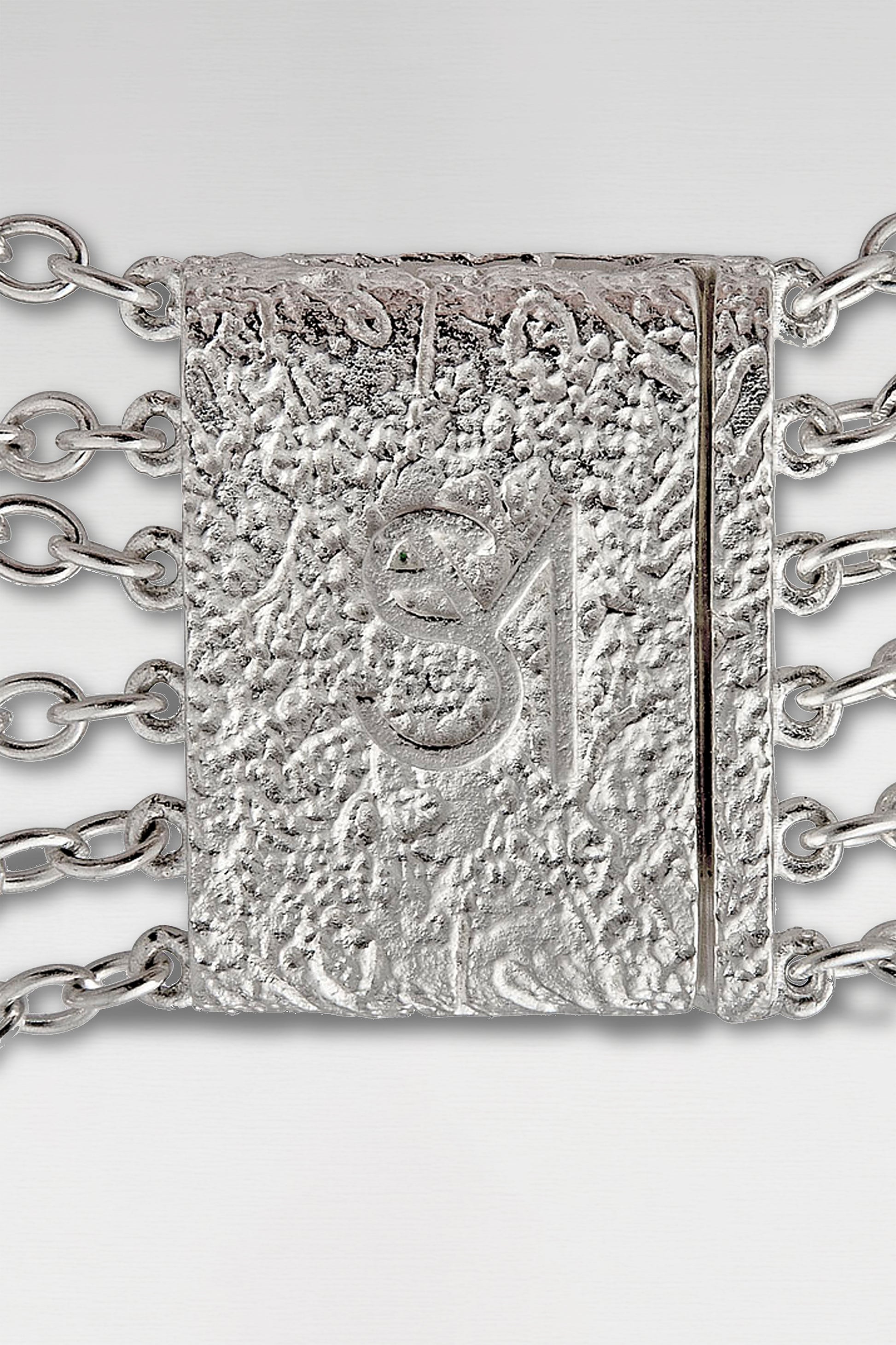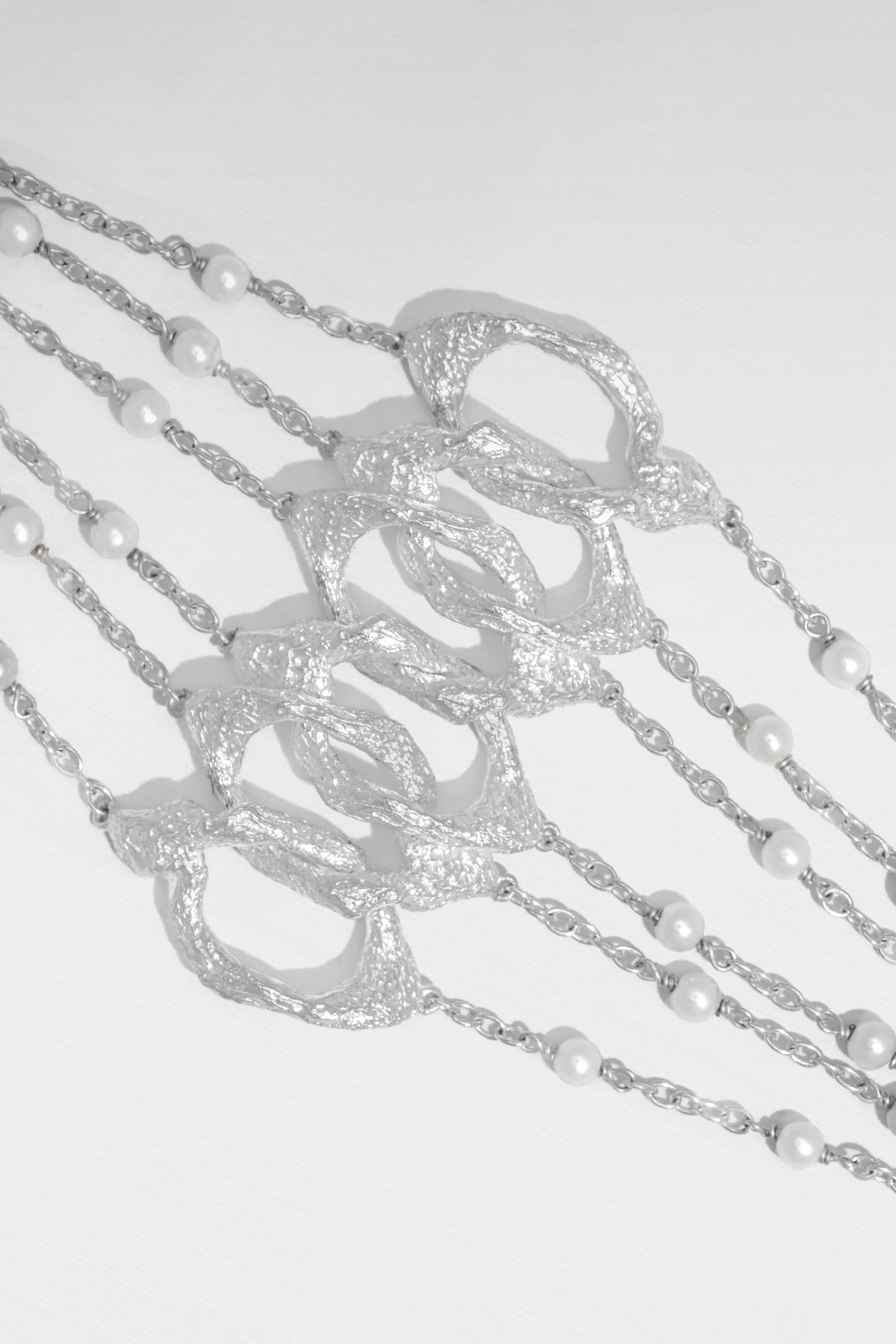 Forged in brass with an 18K gold or silver plate, the Aphrodite cuff features interlocking links reminiscent of rock formations. This piece is secured with a bespoke multi-strand slide-lock tube clasp, ensuring a seamless fusion of form and function. Along its slender chain straps, micro freshwater pearls are interspersed, lending a whisper of softness to this bold and commanding piece.